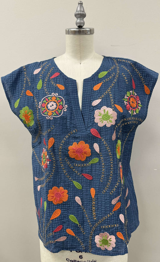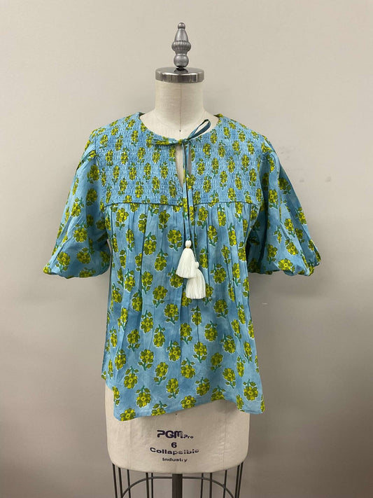 Puff Sleeve Flower Tassel Tie Top in Blue