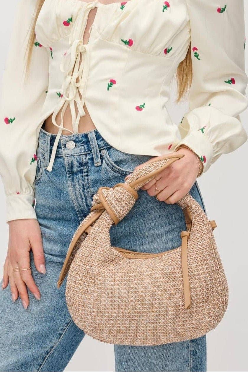Make a statement with our Woven Crossbody. The knotted handle and pull tabs add a playful twist to the woven design, making it a delightful accessory for any occasion. Keep your essentials organized with the fabric-lined interior, including a zip pocket and slip pocket, ensuring you're both trendy and practical.