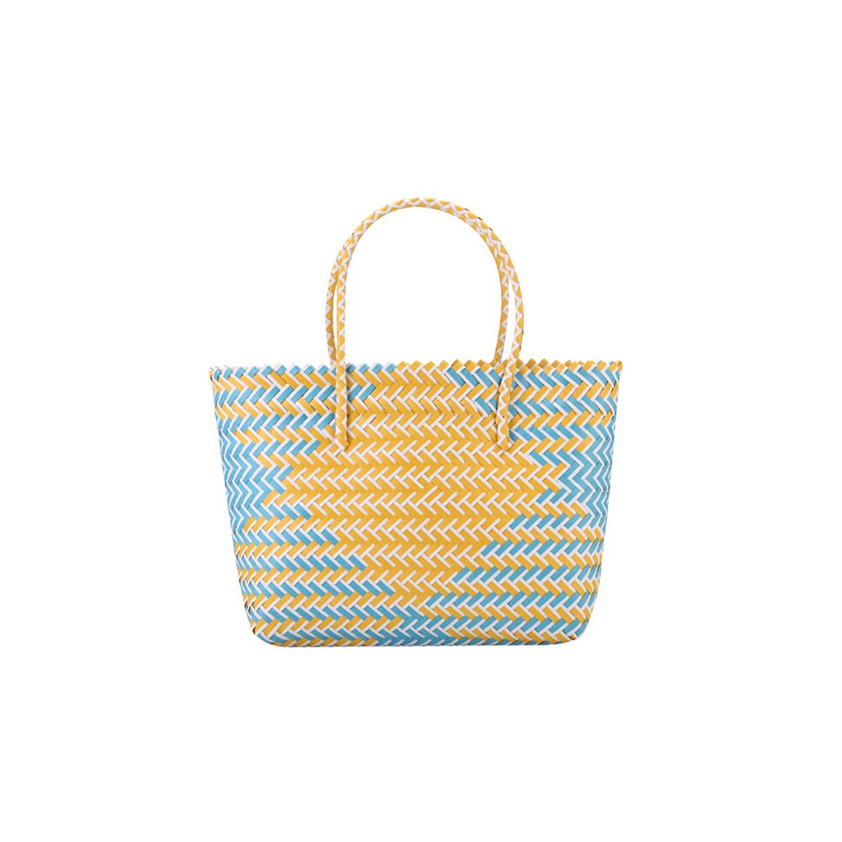 This tote bag displays a vibrant basket weave pattern style. Experience a burst of creativity in accessorizing as this piece effortlessly sets the tone for your unique style.