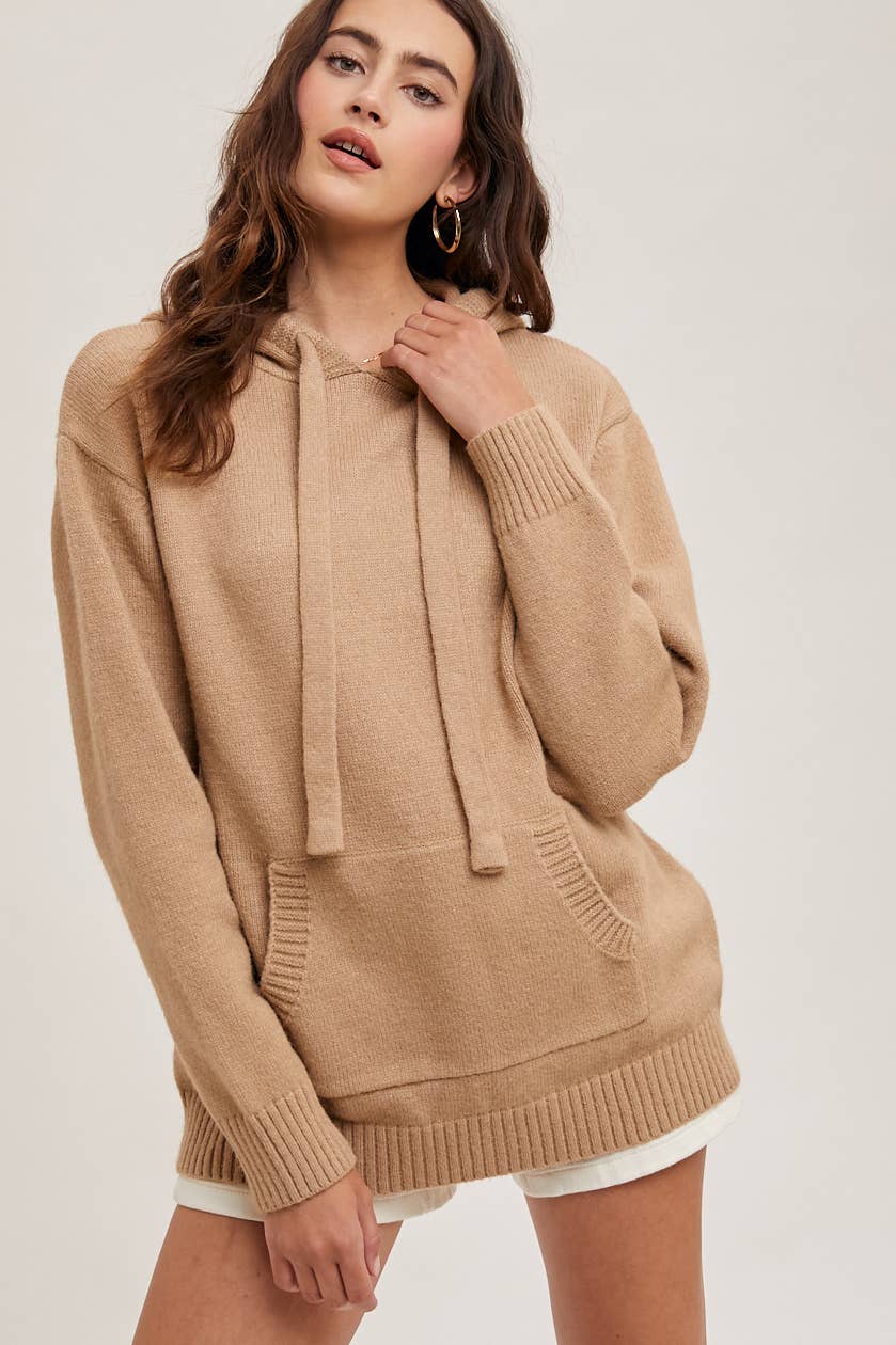 Front pocket knit sweater hooded top. This casual and cozy hooded top features a convenient front pocket, perfect for keeping your hands warm or storing small essentials. Crafted from soft knit fabric, it offers comfort and a relaxed fit, making it ideal for everyday wear. The attached hood adds a laid-back vibe, while the front pocket adds both functionality and style, making this sweater a versatile piece for layering or wearing on its own.