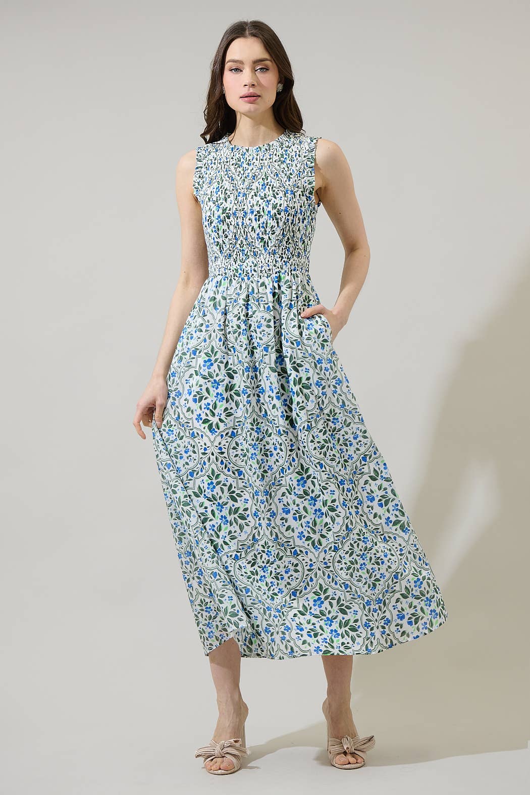 "Add a cute ditsy floral touch your style when you wear the Hilo Floral Cecil Smocked Midi Dress. This relaxed maxi features a smocked and a sleeveless bodice. The back has a keyhole button. Easy to pair with any heels or shoes of your choice.