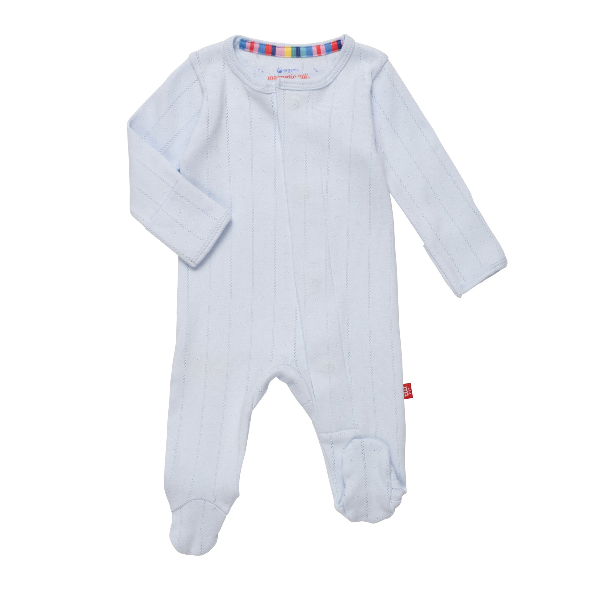 Experience the perfect combination of comfort and style with our Love Lines Blue Pointelle Footie. Made from high-quality materials, this footie features a delicate pointelle design and soothing blue color for a charming touch. Keep your little one cozy and chic in our footie.