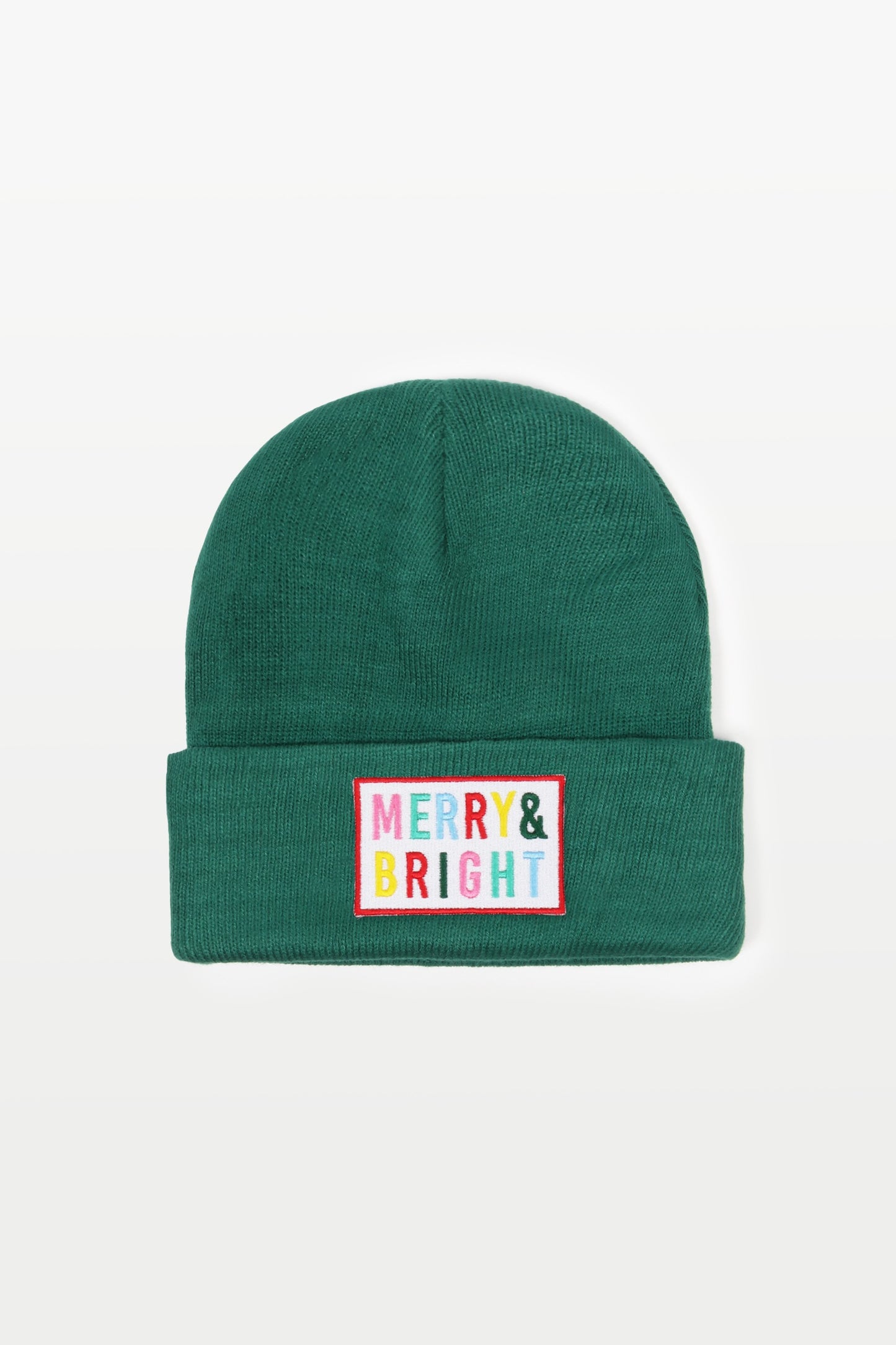 MERRY & BRIGHT Embroidery Patch Christmas Beanie in Green