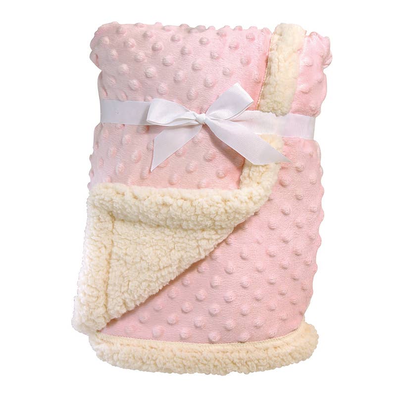 Cozy up with this ultra comfortable pink bumpy sherpa blanket with matching plush lamb snuggle buddy to keep baby warm and happy! Comes on Hanger with Bow.